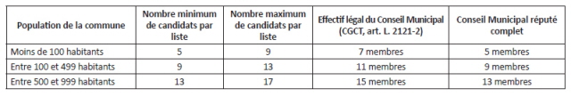 Pour tenir compte de la spécificité des communes de moins de 1000 habitants, la liste de candidats est réputée complète si elle compte jusqu’à deux candidats de moins que l’effectif du Conseil Municipal complet prévu à l’article L.2121-2 du Code général des collectivités territoriales (article L. 252 du Code électoral).