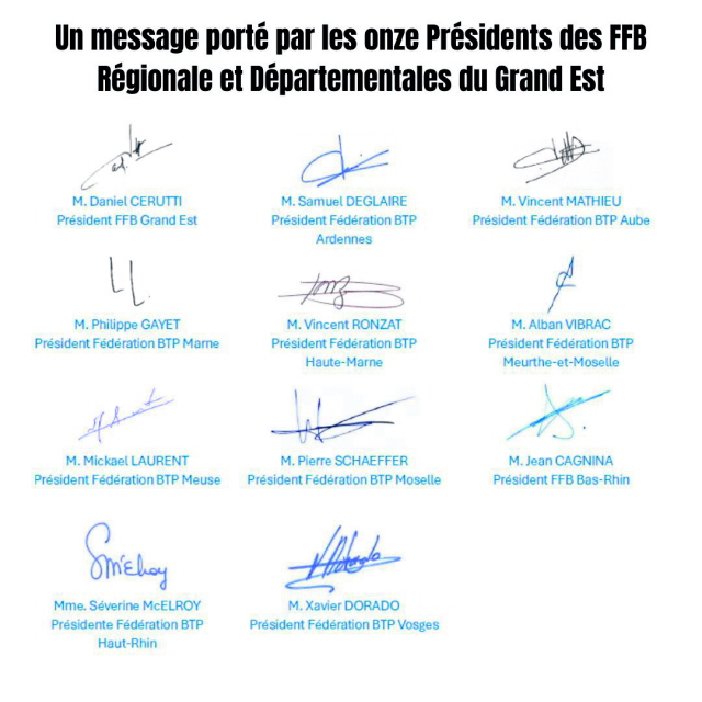 Les onze présidents et présidentes des fédérations du bâtiment du Grand Est « alertent sur la gravité de la situation. Les récentes décisions gouvernementales mettent en péril la filière du bâtiment. Les réformes en cours, qu’il s’agisse de MaPrimRénov’ ou du dispositif REP Bâtiment (Responsabilité élargie du producteur), témoignent d’un manque de cohérence préoccupant dans les politiques publiques. Ce qui devait soutenir la transition énergétique et l’économie circulaire devient aujourd’hui un frein majeur pour l’ensemble du secteur et met en péril des artisans et entreprises du bâtiment. »