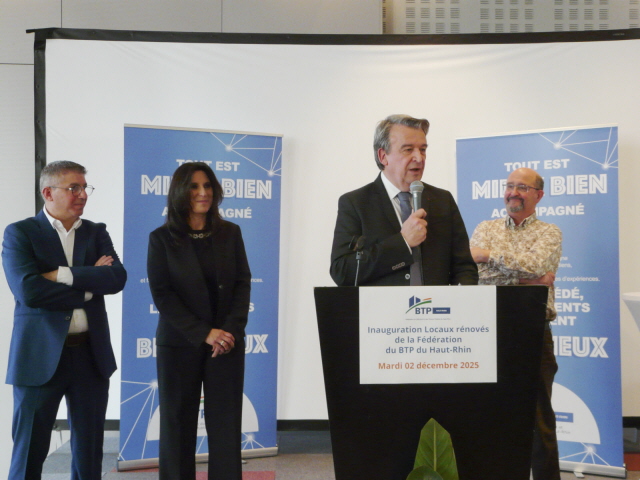 Olivier Salleron, président national de la Fédération Française du Bâtiment, voit dans ce nouvel écrin un ensemble de symboles : « C’est un repère, un élément concret pour se projeter dans l’avenir, une identité territoriale primordiale, un relai de proximité et la démonstration du savoir-faire de la profession », avant de partager son admiration : « Franchement, ça fait longtemps que je n’avais pas vu des locaux aussi beaux ! » Un enthousiasme qui tranche cependant avec la situation peu favorable que traverse actuellement le secteur du BTP, comme l’a rappelé le président de la FFB : « Le climat politique, économique et budgétaire est instable. Le logement neuf s’effondre. Nous faisons face à un défouloir fiscal avec plus de 54 milliards d’euros de taxes prélevées sur nos entreprises. Même si les chiffres sont moindres que prévu, nous allons perdre entre 20 et 25.000 salariés en raison de la crise ». Le président de la FFB entend défendre les intérêts des constructeurs et bâtisseurs, afin de relancer l’activité. Il a appelé à davantage de « cohérence » concernant Ma Prime’Renov et la transition énergétique, plutôt que de voir « changer les règles tous les trois mois ». Il a déclaré vouloir « revigorer » le statut de bailleur privé. Un amendement restaurant le statut de bailleur privé a bien été adopté par les sénateurs le 30 novembre dernier. À Mulhouse, devant les chefs d’entreprise, Olivier Salleron a qualifié cette avancée de « succès fragile ». Sur ce sujet, l’objectif est de « convaincre Bercy d’aller plus loin », afin de créer « un choc d’investissements » et « faciliter l’investissement dans la construction et la rénovation de 50 à 70.000 logements en France ». À l’approche des municipales, Olivier Salleron s’est dit prêt à soutenir « les maires bâtisseurs », avec ce slogan : « Les maires avec grues seront les maires réélus ou élus ! » Olivier Salleron a, également, évoqué le dispositif REP - Responsabilité élargie du producteur, régissant la collecte des déchets de chantier, dont la mise en œuvre est source de crispations, sujet qu’il allait soumettre, dès le lendemain de sa venue à Mulhouse, à Mathieu Lefèvre, ministre délégué chargé de la transition écologique. Le président de la FFB a terminé son discours par quelques notes positives. « Je suis optimiste. Le secteur est solide, les besoins sont importants. Il faudra bien construire et rénover. Nous continuerons à investir dans la formation, l’innovation pour attirer les jeunes talents. J’en veux pour preuve les bons chiffres de l’apprentissage et les 100.000 apprentis recensés en 2024, contre 60.000 il y a quelques années. Offrons-leur une image de la profession fière, solide et essentielle. C’est tout le sens du combat qui nous rassemble aujourd’hui. »